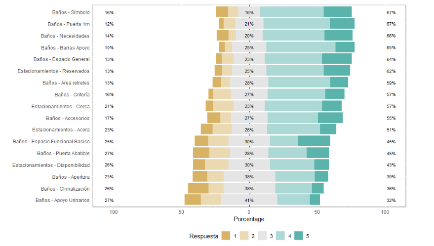 En cuanto a los cuartos de baño, la mayoría puntuó una percepción de accesibilidad adecuada, destacando los espacios internos con un 67%, sus accesorios y el uso del espacio con un 66%. En cuanto al aparcamiento, se observa un comportamiento similar, donde destaca el uso reservado con un 62%, pero con una tendencia decreciente hasta el 43% (Figura 2).