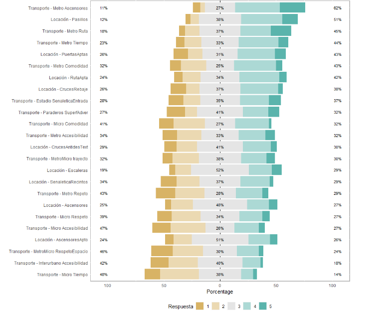 En cuanto al transporte, se observan las percepciones de accesibilidad más bajas, donde el uso de los tiempos de transbordo de los microbuses y sus espacios fluctúa entre el 46-48% de deficiencia. Entre el 18-14% se consideran adecuados. También, en cuanto a la ubicación, destaca la inadecuación de los ascensores con un 25% (Figura 3).