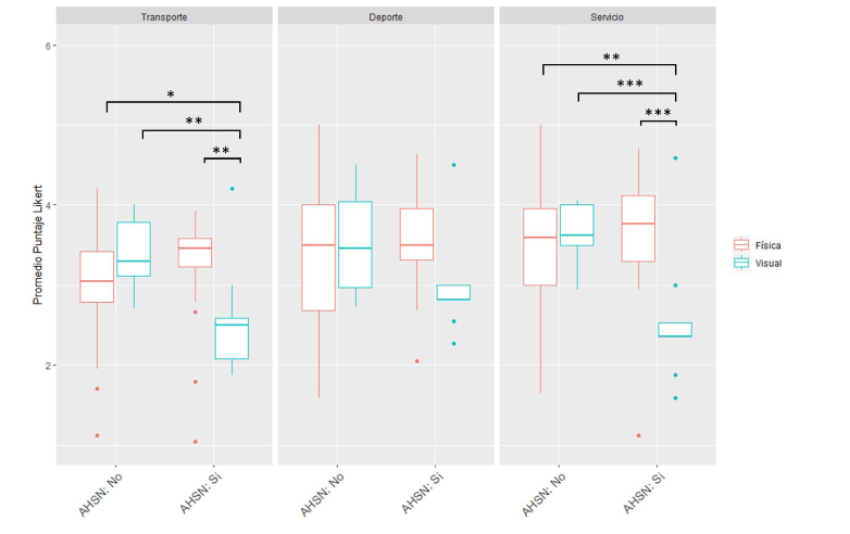 El siguiente objetivo fue establecer si las diferencias en las percepciones de los participantes se debían a su tipo de discapacidad o a la AANA. Para ello, se promediaron los valores de percepción evaluados con una escala Likert para cada dominio. Estas medias se contrastaron mediante un ANOVA 2x2 de medidas independientes (tipo de discapacidad x AANA). En concreto, las medias de las preguntas Likert para cada dominio se utilizaron como variables dependientes, produciendo un total de 3 ANOVAs. Cada ANOVA engloba un factor de discapacidad (física, visual) y otro para AANA (dicotomizado como Sí o No), para este análisis comparativo se consideraron todos los ítems de dominio. Se evaluó si las variables dependientes tenían una distribución normal mediante la prueba de Shapiro-Wilk. La homocedasticidad se evaluó mediante la prueba de Levene para la homogeneidad de la varianza. En caso de no cumplir el supuesto de normalidad, se mantuvo el ANOVA, considerando su robustez a la violación de la normalidad (Schmider et al., 2010). Las pruebas no paramétricas de Levene solo se llevan a cabo si no hay homocedasticidad. En caso de interacciones significativas, se utilizó la prueba post hoc de Tukey. Durante estos análisis, se eliminaron del análisis las personas con discapacidades físicas y visuales. Todos los análisis estadísticos se realizaron utilizando el proyecto R (R Core Team, 2021).