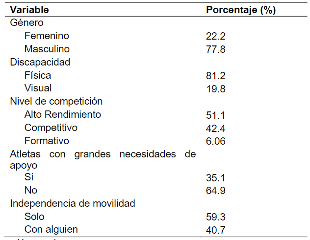 La muestra de este estudio consistió en un total de 96 paratletas chilenos, con un 22.2% de mujeres y un 77.8% de hombres, que aceptaron formar parte del estudio, edad media = 31.0 11.6 años (Tabla 1). Para la selección de los participantes, los criterios de inclusión fueron ser deportistas paralímpicos afiliados al Comité Paralímpico Chileno, tener clasificación deportiva/funcional vigente y firmar el consentimiento informado. Los criterios de exclusión fueron que el atleta no quisiera participar y que no hubiera participado en las sedes que forman parte del evento Santiago 2023. El cuestionario fue enviado a la base de datos del Comité Paralímpico de Chile a través de los responsables del área técnica. Un total de 627 correos electrónicos fueron enviados por el Comité Paralímpico de Chile a los atletas en su base de datos; 123 respondieron a la encuesta y 27 fueron excluidos debido a la duplicación o porque no querían participar.
