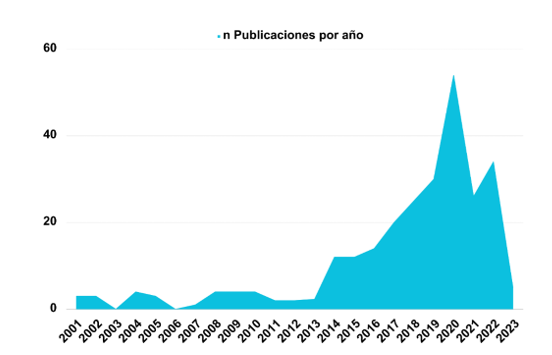 El crecimiento de las CMH ha sido particularmente pronunciado a lo largo del último quinquenio; incluso, más de la mitad de las publicaciones disponibles en el área, desde el año 2000, aparecieron en los últimos 5 años (ver Figura 3). Este remarcable incremento en la investigación evidencia el creciente interés las CMH, a pesar del hecho que aún existe una falta de recursos e inversión en la investigación.
