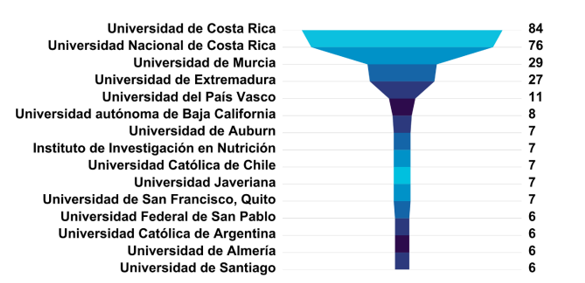 La colaboración a nivel internacional es crucial para el desarrollo y el crecimiento de la investigación de alta calidad en CMH en países en vías de desarrollo como Costa Rica; al colaborar con expertos de distintas partes del mundo, se puede acceder a tecnología de punta, métodos y experticia. Esto contribuiría a superar las limitaciones de los recursos y generar investigaciones innovadoras para impulsar el área significativamente. Adicionalmente, la colaboración internacional promueve el intercambio de ideas y perspectivas y un entendimiento más integral de esta área y sus aplicaciones (Dusdal y Powell, 2021; Green y Johnson, 2015). Esto, sucesivamente, orientaría a mejores soluciones para direccionar las necesidades de salud de la población. Las personas investigadoras en CMH en Costa Rica tienen una amplia red de compañerismo, incluyendo a la Universidad de Extremadura, Universidad de Murcia, Universidad Autónoma de Baja California, entre otros (ver Figura 5).
