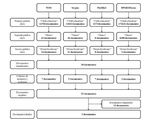 Para la búsqueda y recopilación de documentos científicos, se utilizaron las siguientes bases de datos: Web Of Science (WOS), Scopus, PubMed y SPORTDiscus, por ser las plataformas de datos que cuentan con un mayor número de publicaciones en el ámbito de las Ciencias del Deporte. Para ello, se utilizó la siguiente frase final de búsqueda: (“Child Education” AND “Dance” AND “Down Syndrome”). El procedimiento de búsqueda empleado en cada base de datos, y los resultados que se iban obteniendo a medida que se introducían los términos clave, se muestra en la Figura 1.Finalmente, tras implementar los criterios de inclusión y exclusión, y la eliminación de los documentos duplicados, se seleccionaron un total de 9 manuscritos, incluidos aquellos publicados desde que se tiene constancia, hasta enero de 2023.