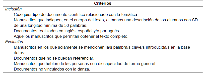 Para la búsqueda y selección de documentos, se emplearon tres palabras clave con el objetivo de obtener el mayor número de manuscritos relacionados con la temática de estudio. Los documentos seleccionados para formar parte de la muestra debían de cumplir una serie de criterios de inclusión y exclusión (Tabla 1).