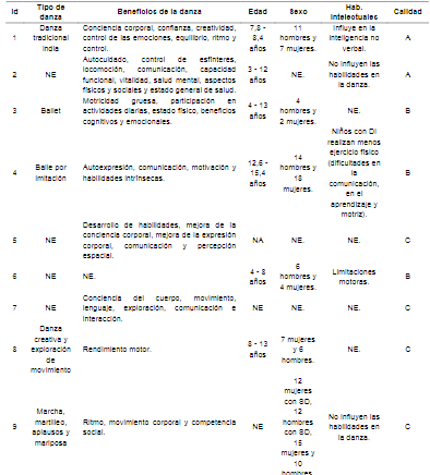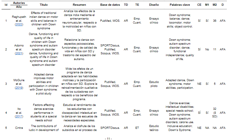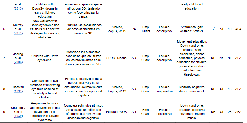 Los documentos seleccionados que se relacionan con la influencia de la danza en el alumnado con SD son escasos y muestran un gran desconocimiento de la temática por parte los profesionales de la educación; son pocos los autores que investigan acerca de la danza como herramienta educativa. Sin embargo, en los últimos años existe un fuerte interés por estas investigaciones, incrementándose el número de estudios publicados en los últimos cinco años.