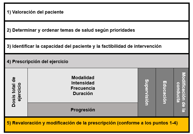 Es necesario contar con prescripción de ejercicio dirigida que incluya consejos y apoyo para la modificación de la conducta, para asegurar así el máximo beneficio (según lo defina cada paciente) en el corto y largo plazo, con un bajo riesgo de perjuicio.