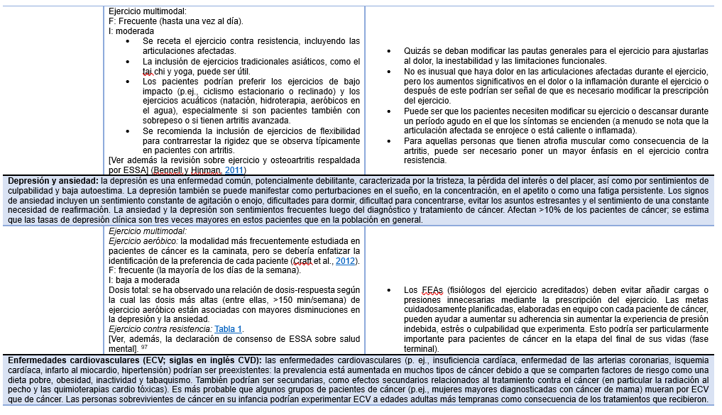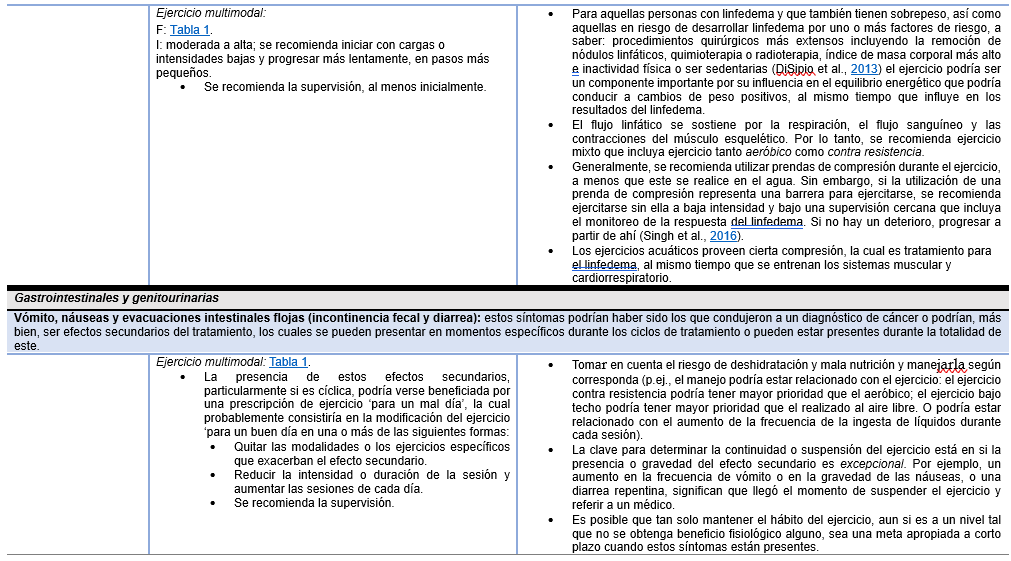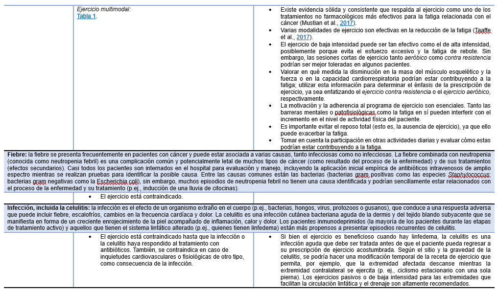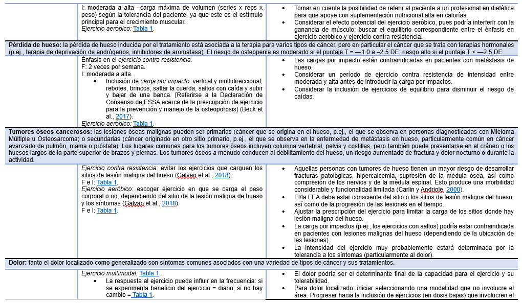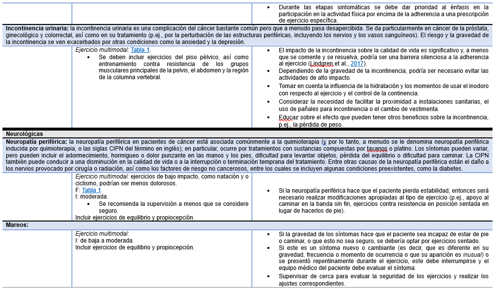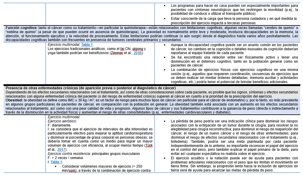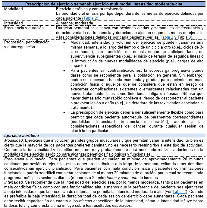 Si bien es cierto que para la mayoría el ejercicio multimodal de intensidad moderada a intensa será apropiado, no hay una prescripción establecida ni una dosificación semanal que se puedan considerar, basadas en la evidencia, para todos los pacientes de cáncer.