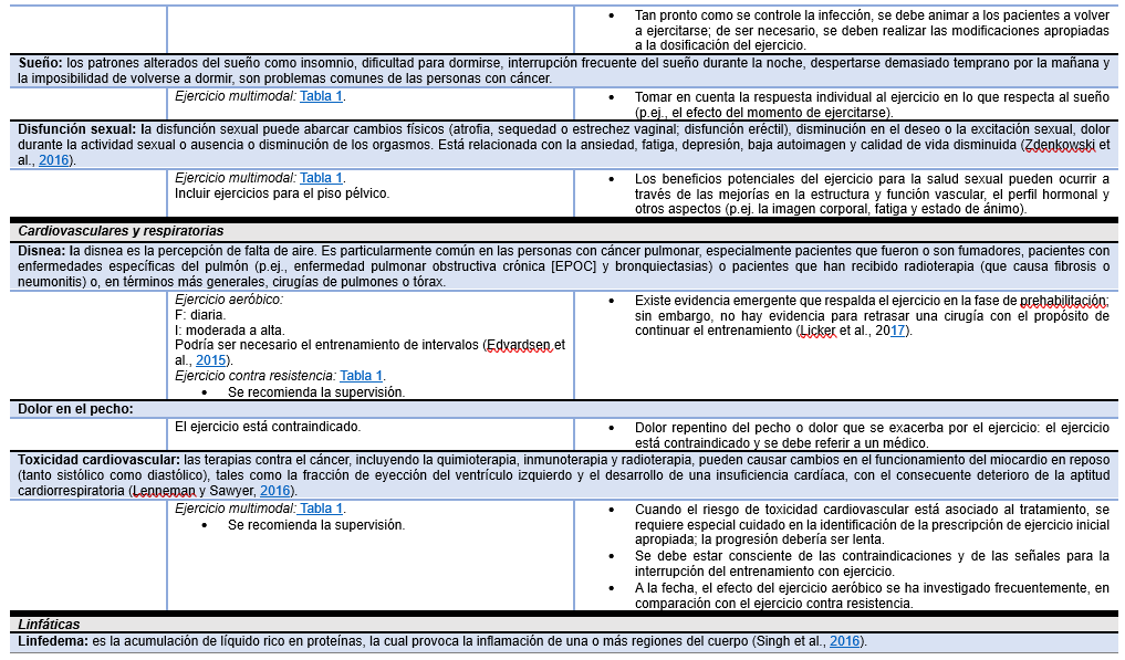 En términos generales, la evidencia respalda la afirmación de que la prescripción de ejercicio trae consigo una disminución en la morbilidad, una mejora en la funcionalidad y en la calidad de vida y la posibilidad de mejorar la supervivencia, con un riesgo muy bajo de daño. Sin embargo, la fuerza de la evidencia para respaldar la seguridad, la factibilidad y los beneficios depende del tipo de cáncer y los resultados esperados. Si bien es cierto que para la mayoría es apropiado el ejercicio multimodal de intensidad entre moderada y alta, no se puede recomendar ninguna prescripción ni dosis semanal total en particular.