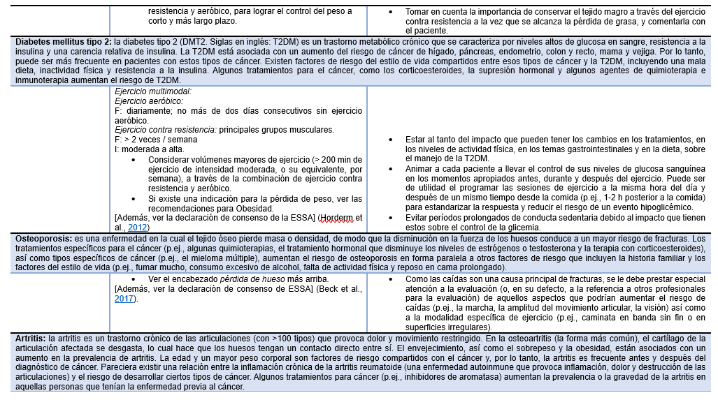 Resumen: Desde la primera publicación de la declaración de consenso sobre pautas de ejercicio para personas con cáncer, de la asociación Ejercicio y Ciencias del Deporte - Australia (ESSA, Exercise and Sports Science Australia), ha ocurrido un crecimiento exponencial en las investigaciones que evalúan el papel del ejercicio antes, durante y después del tratamiento del cáncer. El propósito de este reporte es utilizar la evidencia científica actual, junto a la experiencia clínica y los principios de las ciencias del ejercicio, para poner al día la declaración de consenso de ESSA sobre la prescripción de ejercicio específica para el cáncer. En esta declaración de consenso se reporta un resumen de los beneficios alcanzados mediante el ejercicio luego de un diagnóstico de cáncer, así como las fortalezas y limitaciones de la evidencia acumulada. Se propone, entonces, un marco de prescripción del ejercicio para permitir la aplicación de consideraciones específicas para el cáncer en la individualización, especificidad, seguridad, factibilidad y progresión del ejercicio para toda clase de pacientes. Se ofrecen consideraciones adicionales específicas para la prescripción del ejercicio cuando hay presencia de enfermedades hematológicas, osteomusculares, sistémicas, cardiovasculares, linfáticas, gastrointestinales, genitourinarias y neurológicas y preocupaciones relacionadas con su tratamiento, así como la presencia crónica de comorbilidades. Además, se identifican y comentan temas prácticos específicos y barreras que deben tomarse en cuenta para la prescripción del ejercicio. Si bien es cierto que el ejercicio multimodal de intensidad moderada a intensa será apropiado para la mayoría, no hay una prescripción establecida ni una dosificación semanal, que se puedan considerar basadas en la evidencia, para todos los pacientes de cáncer. Es necesaria una prescripción del ejercicio dirigida específicamente a esta población, que asegure el mayor beneficio (conforme lo defina cada paciente) a corto y largo plazo, con un bajo riesgo de perjuicio.