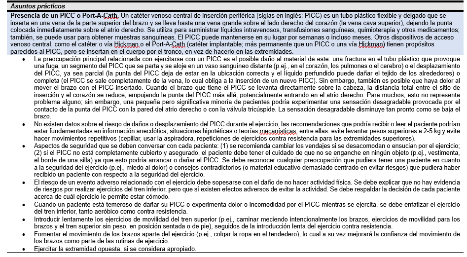 Existe evidencia fuerte de que el ejercicio aporta beneficios cuando se integra durante el tratamiento activo para una gama de tipos de cáncer (Speck et al., 2010), pero no hay evidencia alguna para sugerir que el momento específico de una sesión de ejercicio importa (p. ej., falta evidencia a favor de que el ejercicio durante la perfusión de quimioterapia sea más o menos efectivo, en lo que respecta a la supervivencia, en comparación con ejercicio antes o después de la perfusión. Luego de una revisión de estas publicaciones, una publicación del Colegio Americano de Medicina Deportiva (American College of Sports Medicine) (Campbell et al., 2019) ofrece pautas para la prescripción del ejercicio, específicamente para cáncer, con suficiente evidencia para respaldarlas. La actualización de ESSA sobre pautas para ejercicio y cáncer presenta un proceso que puede servir de guía para la aplicación práctica de dicha evidencia.