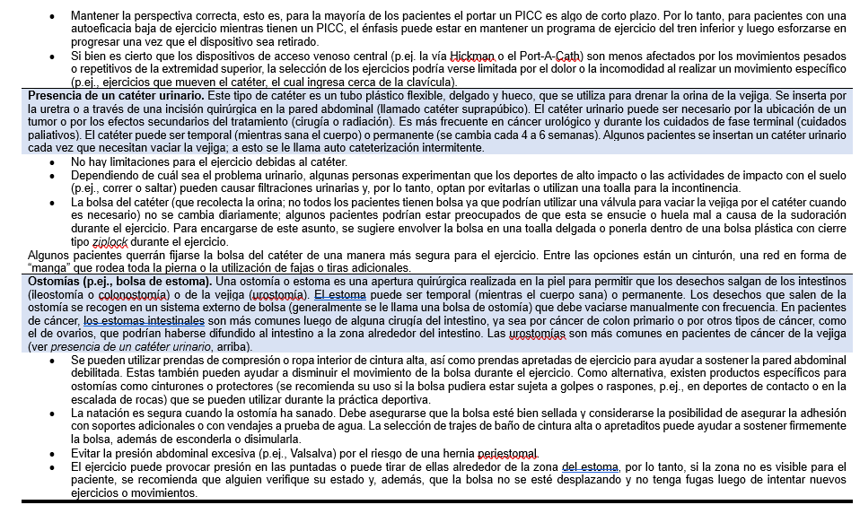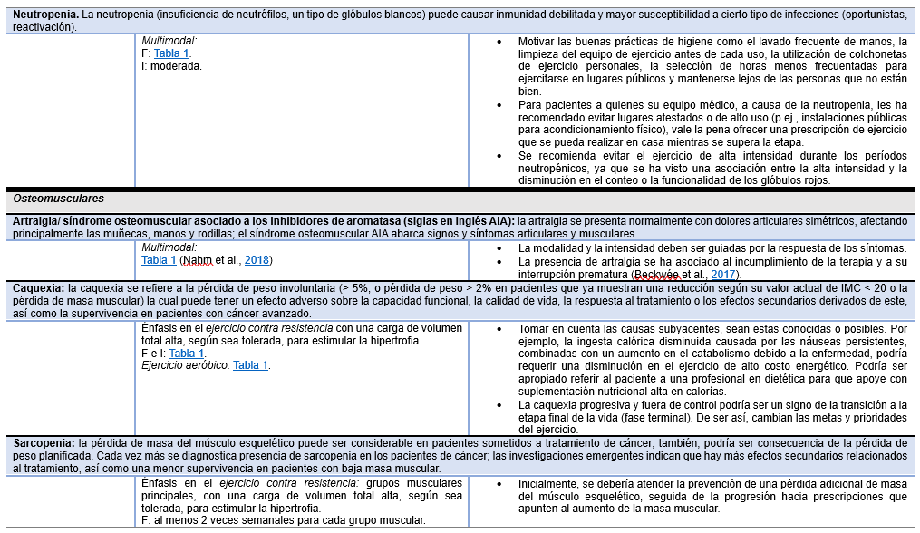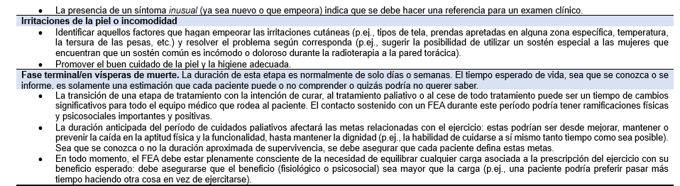Educación y supervisión de la prescripción del ejercicio. Además de los temas comunes de educación relacionada con el ejercicio, tales como la selección de calzado y ropa apropiados, la hidratación, y el uso correcto y seguro del equipo, cada paciente debe adquirir las herramientas para detectar la presencia y gravedad de los efectos secundarios resultantes del tratamiento antes, durante y después de las sesiones de ejercicio, y debe estar en capacidad de reportar la respuesta al ejercicio a su FEA. Esta información permitirá realizar las modificaciones apropiadas a los parámetros de la receta de ejercicio, para efectos de auto regulación, periodización y progresión. Más aún, esta información permite identificar inmediatamente cualquier evento adverso o contraindicación del ejercicio y darles el manejo correspondiente. La presencia de un síntoma fuera de lo común, o un cambio inusual en un síntoma existente, es quizás más relevante que la presencia de un síntoma en sí o de un efecto secundario persistente asociado al tratamiento, como justificación para contraindicar el ejercicio. Naturalmente, para detectar lo ‘inusual’ es necesario primero tener una comprensión clara de aquello que se pueden considerar ‘normal’ o ‘esperado’ para cada paciente en particular.