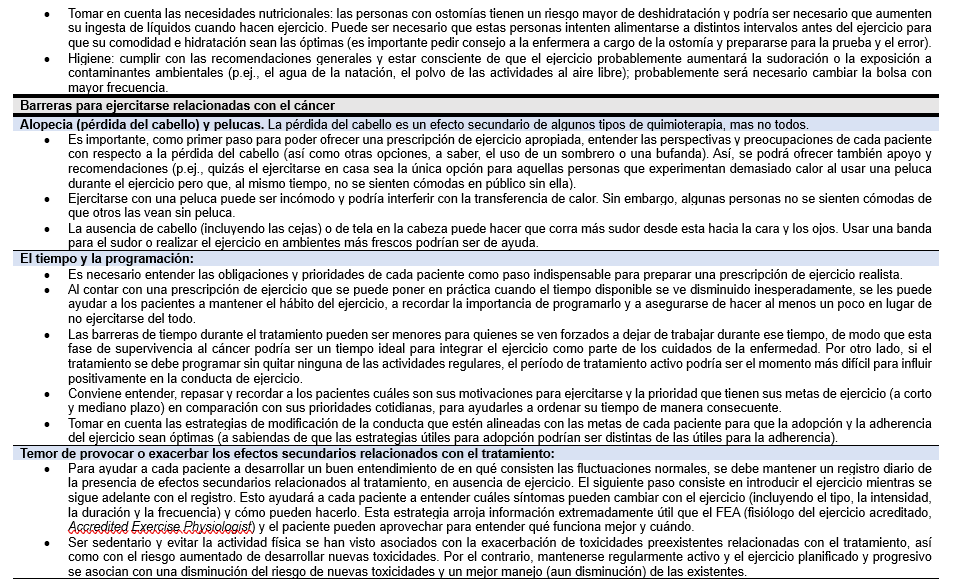 Posteriormente, será necesario identificar y conversar acerca de los factores relacionados con cada paciente que podrían influir sobre esta prescripción individualizada (punto 3, arriba); esto implica entender las circunstancias de cada paciente (como la capacidad funcional actual y sus limitaciones o restricciones físicas), así como sus preferencias en lo que concierne al tipo, frecuencia, intensidad y duración del ejercicio. También, deben contemplarse los recursos económicos disponibles para respaldar la participación en un programa de ejercicio —los cuales influirán sobre el grado de supervisión y sobre dónde se ejecutará este— los conocimientos sobre salud, la autoeficacia en la práctica del ejercicio, la habilidad de identificar y resolver los problemas relacionados con barreras para el ejercicio (que podrían ser generales o específicas al cáncer), la disponibilidad de una red de apoyo que facilite la integración del ejercicio al manejo integral del cáncer y más allá. Finalmente, se debe valorar la motivación para alcanzar objetivos por medio del ejercicio.