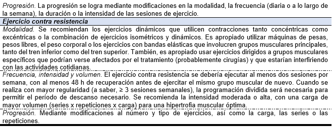 A pesar de que existe un beneficio cruzado del entrenamiento, esto es, que en los pacientes de cáncer el ejercicio contra resistencia producirá una adaptación cardiorrespiratoria y el ejercicio aeróbico puede aumentar la fuerza y la resistencia neuromuscular (Buchan et al., 2016; Buffart et al., 2018), la magnitud del beneficio está bajo la influencia de la especificidad del entrenamiento (Buffart et al., 2018). Así, es apropiado tomar en cuenta las preferencias y los recursos de cada paciente cuando se prescribe la modalidad, en especial durante las etapas tempranas de la prescripción del ejercicio en pacientes con mala condición física. Sin embargo, también es necesario educar a cada paciente en lo que respecta a la modalidad óptima de ejercicio que le permitirá alcanzar las metas que ha definido. Más aún, la modalidad específica seleccionada dentro de las categorías de ejercicio aeróbico o contra resistencia (por ejemplo, ejercicios en el agua versus la utilización de ergómetros versus la caminata, o las máquinas de pesas versus el uso de pesos libres versus las bandas elásticas) debería tomar en cuenta factores específicos al cáncer (Tabla 2), así como las preferencias del paciente.