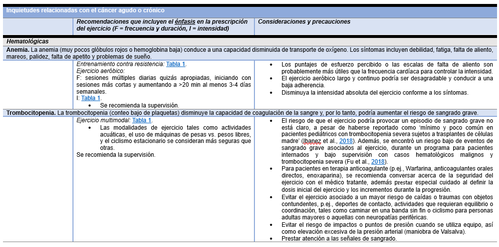 Sin embargo, es necesario advertir que se debe tener cuidado, ya que se desconoce qué tan generalizables son la seguridad, la factibilidad y la eficacia de los hallazgos entre comorbilidades. Aún más, conforme se vayan dilucidando mejor los beneficios del ejercicio luego del cáncer, será prudente que los profesionales del ejercicio tengan siempre presente el daño potencial que puede provocar el ejercicio para poder educar a los pacientes acerca de las contraindicaciones que pueden existir. Estas están relacionadas en gran medida con la presencia de nuevas señales y síntomas o de cambios excepcionales en estos síntomas y señales (Tabla 2). El presente abordaje consiste en hacer énfasis en la utilización de los cambios en las señales y los síntomas para guiar la prescripción del ejercicio o sus modificaciones, a la vez que se continúan reconociendo los riesgos relativos asociados a los marcadores hematológicos anormales u otros indicadores (p. ej., saturación de oxígeno en reposo), cuando se conocen. Este abordaje es parecido al que otros han recomendado recientemente (Santa Mina et al., 2018).