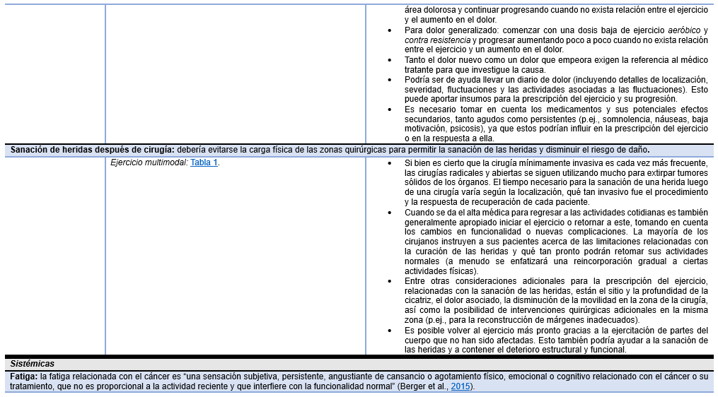 Es importante que los pacientes entiendan en qué consiste su dosis semanal ideal de ejercicio y también si es necesario que dicha dosis se modifique con el tiempo. La conocida relación dosis-respuesta entre el ejercicio y los resultados físicos y sicosociales es relevante para pacientes con cáncer. La evidencia obtenida de una amplia revisión sistemática de estudios de cohorte, en la cual se evalúa la asociación entre la actividad física después del cáncer y la supervivencia, sugiere que una dosis semanal de ejercicio de alrededor de 150 min a intensidad moderada (o el volumen equivalente) representa la dosis aproximada más allá de la cual los beneficios son cada vez menores conforme se progresa a dosis más altas (Li et al., 2016). Sin embargo, existe alguna evidencia que sugiere que el ejercicio a dosis más altas podría aportar beneficios adicionales en aspectos específicos (p.ej., aptitud física) para algunas cohortes en particular, como pacientes con cáncer de colon (Brown et al., 2018). Si bien es cierto que las investigaciones futuras seguirán mejorando el conocimiento acerca de cuáles son los umbrales mínimo y máximo de las dosis y para quiénes son aplicables, es razonable sugerir que la mayoría de los sobrevivientes de cáncer pueden iniciarse en el ejercicio regular de manera segura, siempre y cuando comiencen con dosis cautelosas, hagan un progreso gradual y se hagan las modificaciones apropiadas para la presencia de efectos secundarios y comorbilidades relacionadas con la enfermedad y con el tratamiento (Tabla 2).