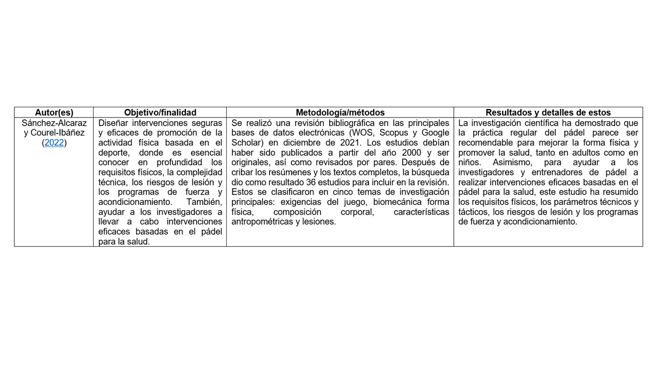 | Sánchez-Alcaraz y Courel-Ibáñez (2022) | Diseñar intervenciones seguras y eficaces de promoción de la actividad física basada en el deporte, donde es esencial conocer en profundidad los requisitos físicos, la complejidad técnica, los riesgos de lesión y los programas de fuerza y acondicionamiento. También, ayudar a los investigadores a llevar a cabo intervenciones eficaces basadas en el pádel para la salud. | Se realizó una revisión bibliográfica en las principales bases de datos electrónicas (WOS, Scopus y Google Scholar) en diciembre de 2021. Los estudios debían haber sido publicados a partir del año 2000 y ser originales, así como revisados por pares. Después de cribar los resúmenes y los textos completos, la búsqueda dio como resultado 36 estudios para incluir en la revisión. Estos se clasificaron en cinco temas de investigación principales: exigencias del juego, biomecánica forma física, composición corporal, características antropométricas y lesiones. | La investigación científica ha demostrado que la práctica regular del pádel parece ser recomendable para mejorar la forma física y promover la salud, tanto en adultos como en niños. Asimismo, para ayudar a los investigadores y entrenadores de pádel a realizar intervenciones eficaces basadas en el pádel para la salud, este estudio ha resumido los requisitos físicos, los parámetros técnicos y tácticos, los riesgos de lesión y los programas de fuerza y acondicionamiento. |