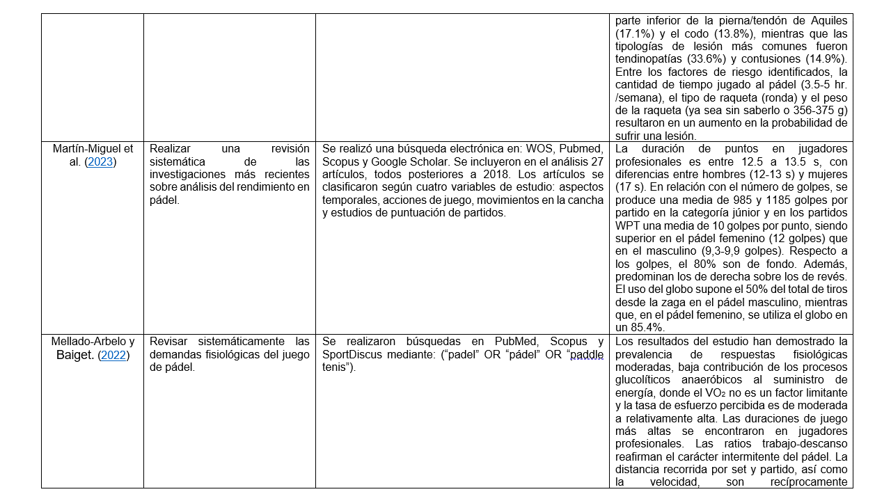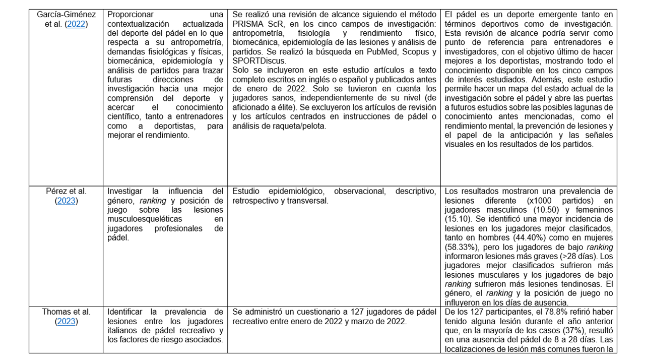| García-Giménez et al. (2022) | Proporcionar una contextualización actualizada del deporte del pádel en lo que respecta a su antropometría, demandas fisiológicas y físicas, biomecánica, epidemiología y análisis de partidos para trazar futuras direcciones de investigación hacia una mejor comprensión del deporte y acercar el conocimiento científico, tanto a entrenadores como a deportistas, para mejorar el rendimiento. | Se realizó una revisión de alcance siguiendo el método PRISMA ScR, en los cinco campos de investigación: antropometría, fisiología y rendimiento físico, biomecánica, epidemiología de las lesiones y análisis de partidos. Se realizó la búsqueda en PubMed, Scopus y SPORTDiscus. Solo se incluyeron en este estudio artículos a texto completo escritos en inglés o español y publicados antes de enero de 2022. Solo se tuvieron en cuenta los jugadores sanos, independientemente de su nivel (de aficionado a élite). Se excluyeron los artículos de revisión y los artículos centrados en instrucciones de pádel o análisis de raqueta/pelota. | El pádel es un deporte emergente tanto en términos deportivos como de investigación. Esta revisión de alcance podría servir como punto de referencia para entrenadores e investigadores, con el objetivo último de hacer mejores a los deportistas, mostrando todo el conocimiento disponible en los cinco campos de interés estudiados. Además, este estudio permite hacer un mapa del estado actual de la investigación sobre el pádel y abre las puertas a futuros estudios sobre las posibles lagunas de conocimiento antes mencionadas, como el rendimiento mental, la prevención de lesiones y el papel de la anticipación y las señales visuales en los resultados de los partidos. |