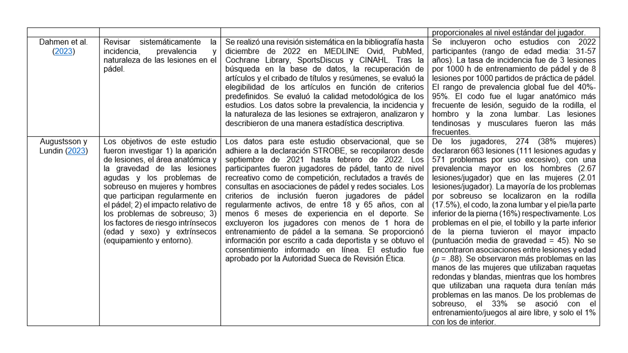| Augustsson y Lundin (2023) | Los objetivos de este estudio fueron investigar 1) la aparición de lesiones, el área anatómica y la gravedad de las lesiones agudas y los problemas de sobreuso en mujeres y hombres que participan regularmente en el pádel; 2) el impacto relativo de los problemas de sobreuso; 3) los factores de riesgo intrínsecos (edad y sexo) y extrínsecos (equipamiento y entorno). | Los datos para este estudio observacional, que se adhiere a la declaración STROBE, se recopilaron desde septiembre de 2021 hasta febrero de 2022. Los participantes fueron jugadores de pádel, tanto de nivel recreativo como de competición, reclutados a través de consultas en asociaciones de pádel y redes sociales. Los criterios de inclusión fueron jugadores de pádel regularmente activos, de entre 18 y 65 años, con al menos 6 meses de experiencia en el deporte. Se excluyeron los jugadores con menos de 1 hora de entrenamiento de pádel a la semana. Se proporcionó información por escrito a cada deportista y se obtuvo el consentimiento informado en línea. El estudio fue aprobado por la Autoridad Sueca de Revisión Ética. | De los jugadores, 274 (38% mujeres) declararon 663 lesiones (111 lesiones agudas y 571 problemas por uso excesivo), con una prevalencia mayor en los hombres (2.67 lesiones/jugador) que en las mujeres (2.01 lesiones/jugador). La mayoría de los problemas por sobreuso se localizaron en la rodilla (17.5%), el codo, la zona lumbar y el pie/la parte inferior de la pierna (16%) respectivamente. Los problemas en el pie, el tobillo y la parte inferior de la pierna tuvieron el mayor impacto (puntuación media de gravedad = 45). No se encontraron asociaciones entre lesiones y edad (p = .88). Se observaron más problemas en las manos de las mujeres que utilizaban raquetas redondas y blandas, mientras que los hombres que utilizaban una raqueta dura tenían más problemas en las manos. De los problemas de sobreuso, el 33% se asoció con el entrenamiento/juegos al aire libre, y solo el 1% con los de interior. |
