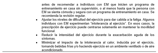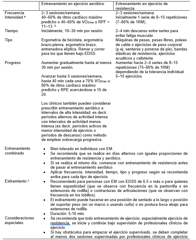 Con la evidencia actual de los efectos de los diferentes tipos de ejercicio en la EM, se han publicado recomendaciones o lineamientos para ejercicios específicos la enfermedad (p.ej. Dalgas et al., 2008; Halabchi et al., 2017; Kalb et al., 2020; Kim et al., 2019; Latimer-Cheung et al., 2013). Las recomendaciones para la prescripción de ejercicio para las personas con EM que se presentan en la Tabla 3 se basan en información suministrada en esas publicaciones (Dalgas et al., 2008; Halabchi et al., 2017; Kalb et al., 2020; Kim et al., 2019; Latimer-Cheung et al., 2013). En las referencias suplementarias se pueden encontrar referencias específicas a estudios individuales.