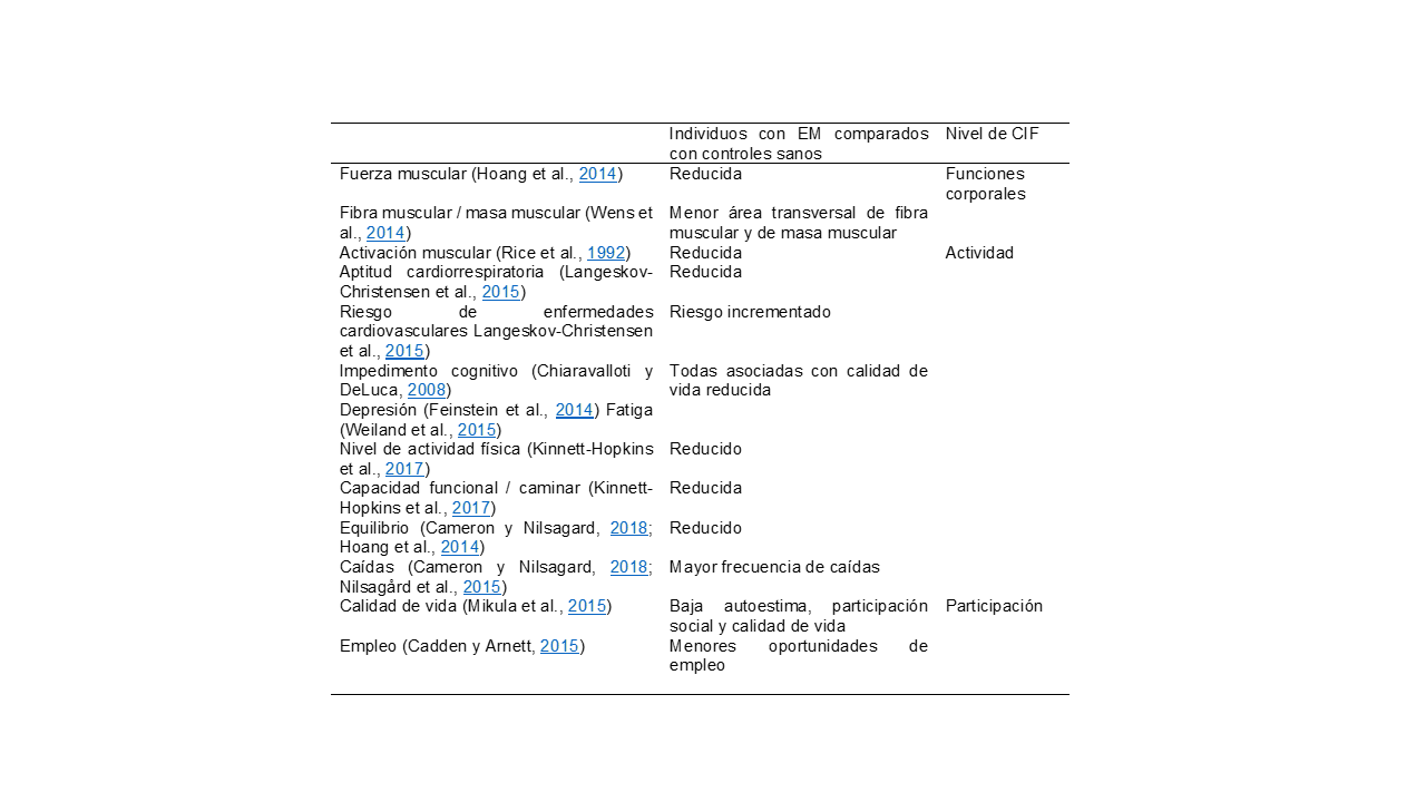 En comparación con personas sanas de edades similares, el perfil fisiológico de las personas con EM se caracteriza por síntomas físicos y mentales significativos, particularmente, debilidad muscular (Hoang et al., 2014), dificultades para caminar y problemas de equilibrio (Cameron y Nilsagard, 2018; Hoang et al., 2014), espasticidad (Rizzo et al., 2004), fatiga (Weiland et al., 2015), impedimento cognitivo (Chiaravalloti y DeLuca, 2008; Patti, 2009), depresión (Feinstein et al., 2014) y baja aptitud cardiorrespiratoria (Langeskov-Christensen et al., 2015; Mostert y Kesselring, 2002; Motl et al., 2015; Sandoval, 2013). Además, las personas con EM están en riesgo de desarrollar diversas condiciones que, se sabe, están relacionadas con la inactividad, incluyendo enfermedades cardiovasculares (Jadidi et al., 2013; Wens et al., 2013), diabetes tipo 2 (Hussein y Reddy, 2006; Marrie et al., 2015) y osteoporosis (Bisson et al., 2019). La Tabla 1 presenta un resumen del perfil típico de las personas con EM en comparación con personas de control sanas.