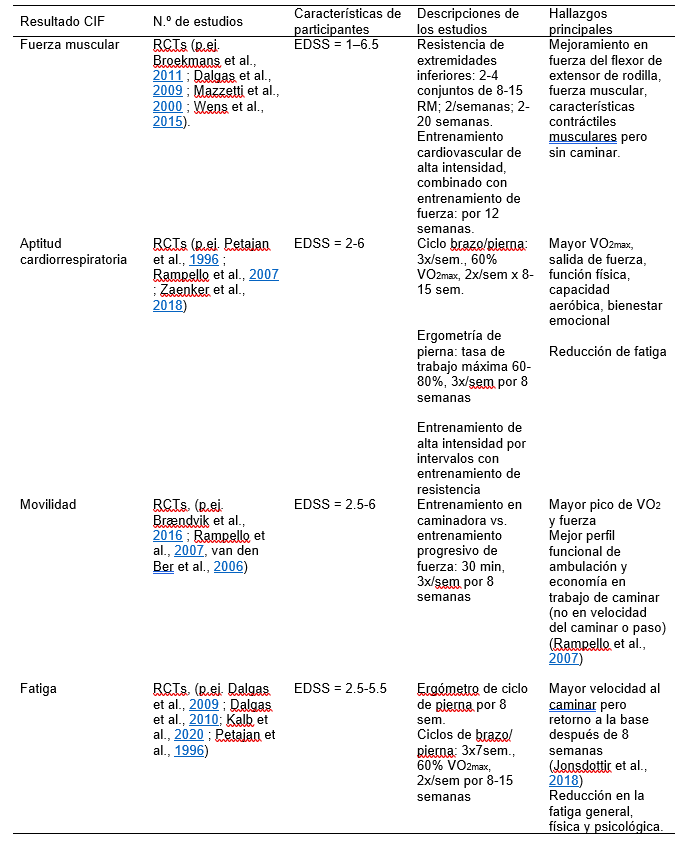 ICF = Clasificación Internacional de Funciones; RM = Repetición Máxima; 6-MWT = Prueba de Caminata de 6 minutos; TUG = Cronometrar y salir; EDSS = Escala Expandida de Estatus de Discapacidad (Kurtzke et al., 1983); RCTs = Randomized Control Trials (ensayos controlados aleatorios).