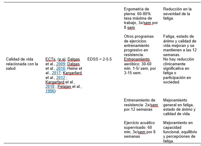 Algunas pruebas clínicas han reportado que tanto el entrenamiento aeróbico (Schulz et al., 2004) como el de resistencia (Dalgas et al., 2010) pueden fortalecer la calidad de vida de las personas con EM por medio del mejoramiento en las funciones corporales, la fatiga y la eficacia personal (Motl y McAuley, 2009); sin embargo, los hallazgos de las revisiones sistemáticas no son conclusivos (Latimer-Cheung et al., 2013; Motl y Gosney, 2008). Se está acumulando la evidencia que apoya los efectos positivos del ejercicio sobre la reducción de recaídas en las personas con EM de remisión y recaída, la ralentización del progreso de la discapacidad y un posible efecto de modificación de la enfermedad (Dalgas y Stenager, 2012; Dalgas et al., 2019). Sin embargo, es insuficiente la investigación de alta calidad que respalde el ejercicio como una intervención eficaz para mejorar la cognición en la EM (Sandroff et al., 2016). Los beneficios del ejercicio en la EM, según se identifican por revisiones sistemáticas, se resumen en la Tabla 2.