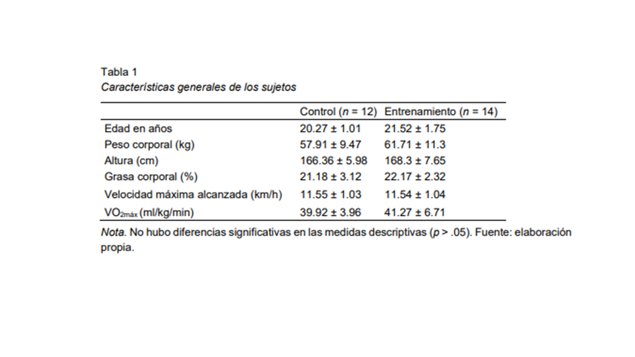 El entrenamiento se aplicó a las mismas horas del día (01:00 p.m. – 03:00 p.m.). Durante el estudio, los participantes no realizaron actividades deportivas regulares distintas de sus rutinas habituales.