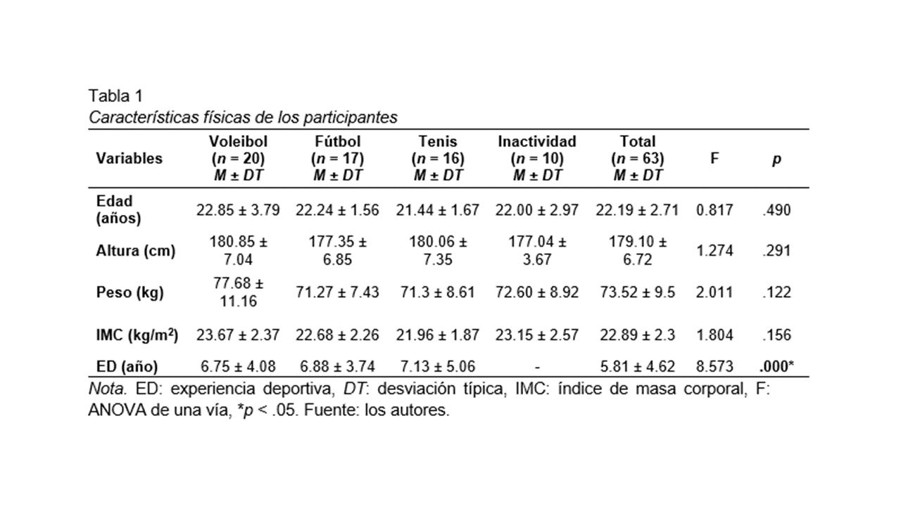 En este estudio se incluyó una muestra de 63 participantes (20 jugadores de voleibol, 17 de fútbol, 16 de tenis y 10 inactivos). Como resultado de las pruebas de normalidad, se comprobó que las variables se distribuían normalmente. Según el análisis de varianza unidireccional, las propiedades físicas de los grupos resultaron ser similares, excepto en el caso de la experiencia deportiva (p > .05). La experiencia deportiva también fue similar en las distintas ramas deportivas. Las características físicas de los participantes figuran en la Tabla 1 (Özen Oruk et al., 2024).