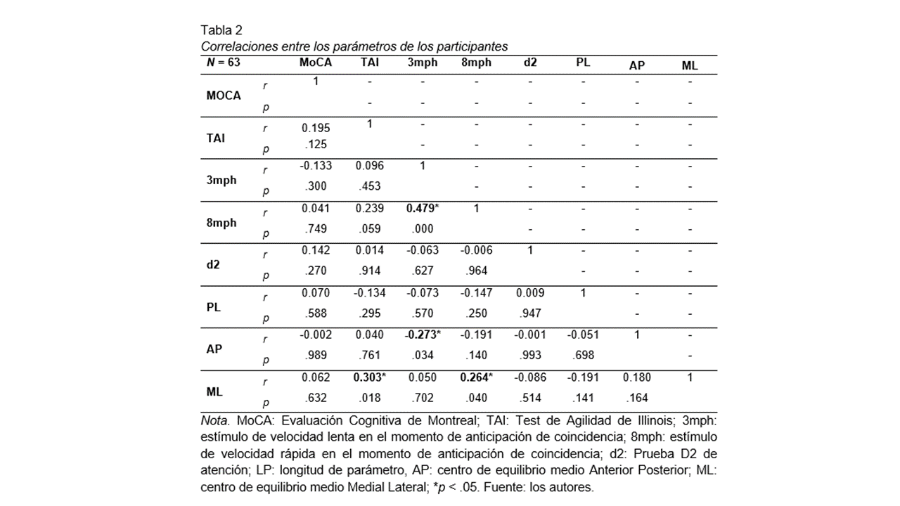 Como resultado del análisis de correlación entre los tiempos TAI y otros parámetros, se encontraron correlaciones débiles positivas con EA a 8 mph (r = 0.260, p = .040) y valores ML de equilibrio (r = 0.255, p = .043). Mientras que hubo una correlación débil negativa entre EA a 3 mph y los valores AP de equilibrio (r = -0.267, p = .035), se encontró una correlación débil positiva entre EA a 8 mph y los valores ML de equilibrio (r = .253, p = .046). Además, hubo una correlación positiva moderada entre ambas puntuaciones de EA, como se esperaba (r = .495, p = .000). Las relaciones entre las demás mediciones no fueron significativas (p > .05). Todas las correlaciones entre parámetros se muestran en la Tabla 2.
