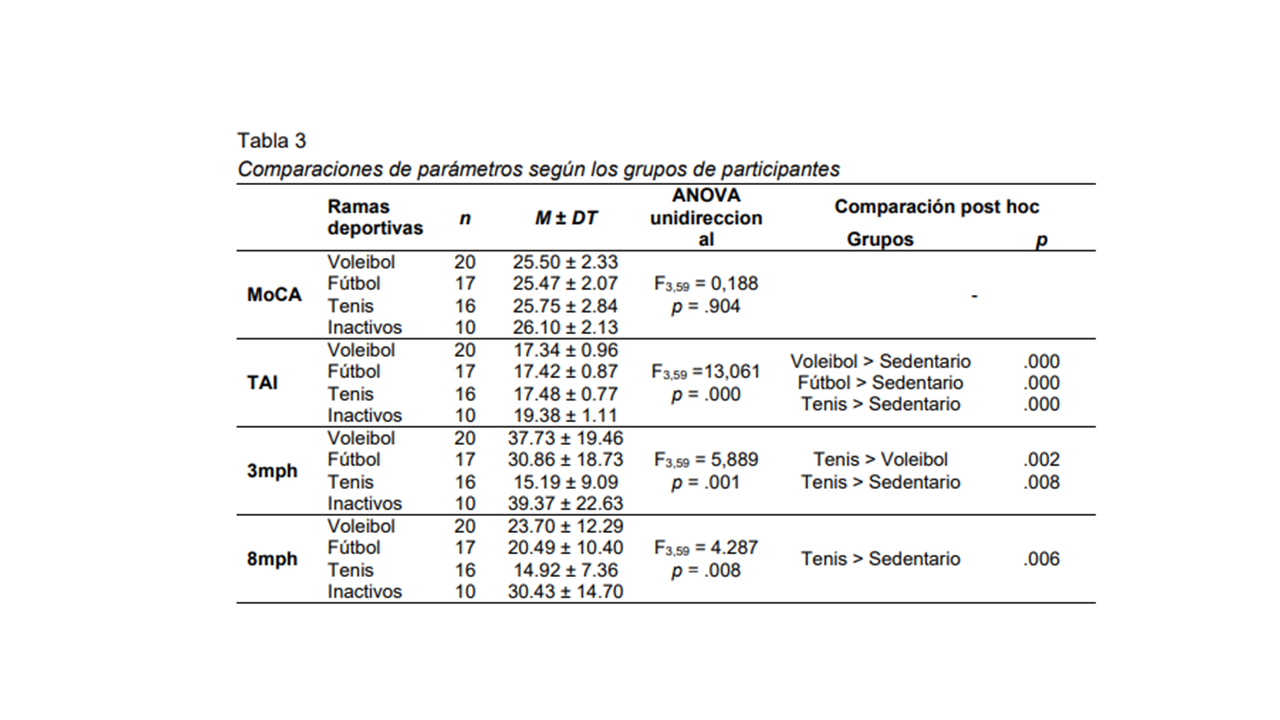 En comparación con los deportistas, se observó que las puntuaciones del TAI del grupo inactivo eran significativamente inferiores (p = .000). Los resultados del análisis de varianza unidireccional según el EA a velocidad de estímulo lenta (3 mph) indicaron una diferencia significativa entre los tenistas y los jugadores de voleibol e inactivos (p = .002 y p = .008, respectivamente). Cuando se comparó el EA a velocidad de estímulo rápida (8 mph) de los participantes según su grupo, la única diferencia estadísticamente significativa se encontró entre los jugadores de tenis y los inactivos (p = .008). No hubo diferencias significativas entre las puntuaciones de MoCA, d2 y equilibrio al comparar los grupos (p > .008). Todas las comparaciones según los grupos se presentaron en la Tabla 3.