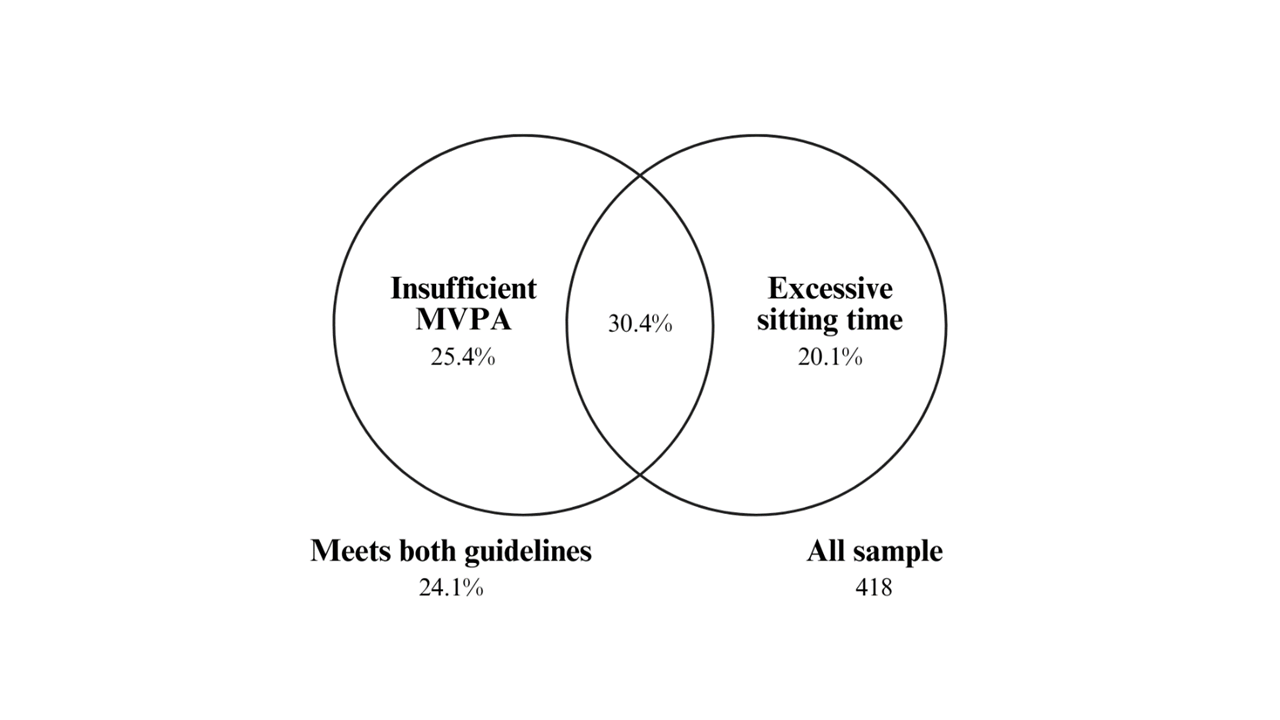 Overall, 25.4% of university students were insufficiently active, failing to meet the recommendations for MVPA, while 20.1% had excessive sitting time. In addition, 30.4% did not meet the guidelines for both MVPA and sitting time, and only 24.1% of students managed to meet both recommendations (Figure 1).