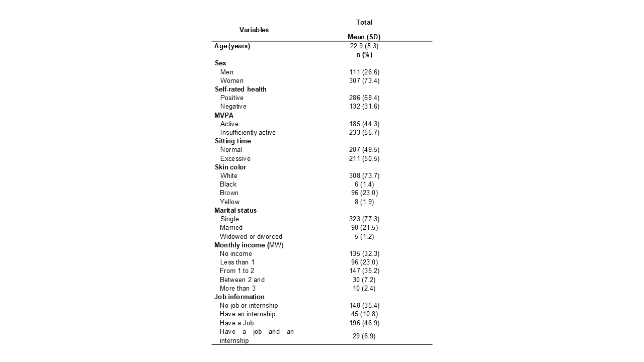 Of the 2100 university students potentially eligible for the study, 450 participated. Of these, 32 were excluded due to incomplete information on physical activity and sitting time, resulting in a final sample of 418 university students with valid data. The average age of the participants was 22.9 (5.3) years, they were female (73.4%), white skin color (73.7%), and were single (77.3%). Regarding work and income information, the vast majority stated that they received between one and two minimum wages (35.3%) and had a paid job (46.9%).