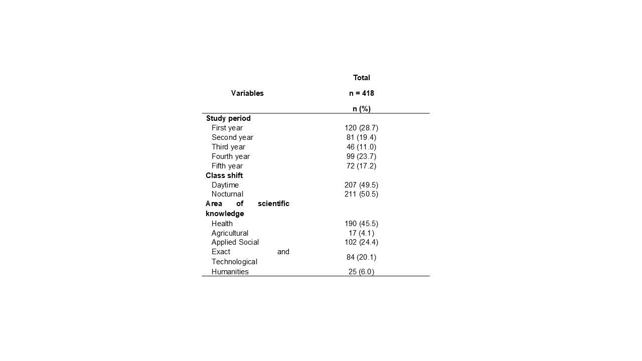 From the results presented in Table 2, it is possible to observe characteristics related to the participants' undergraduate course. In general, most participants were in the first or second phase of their undergraduate studies (28.7%), their classes were at night (50.5%), and they were in the health sciences area (45.5%).
