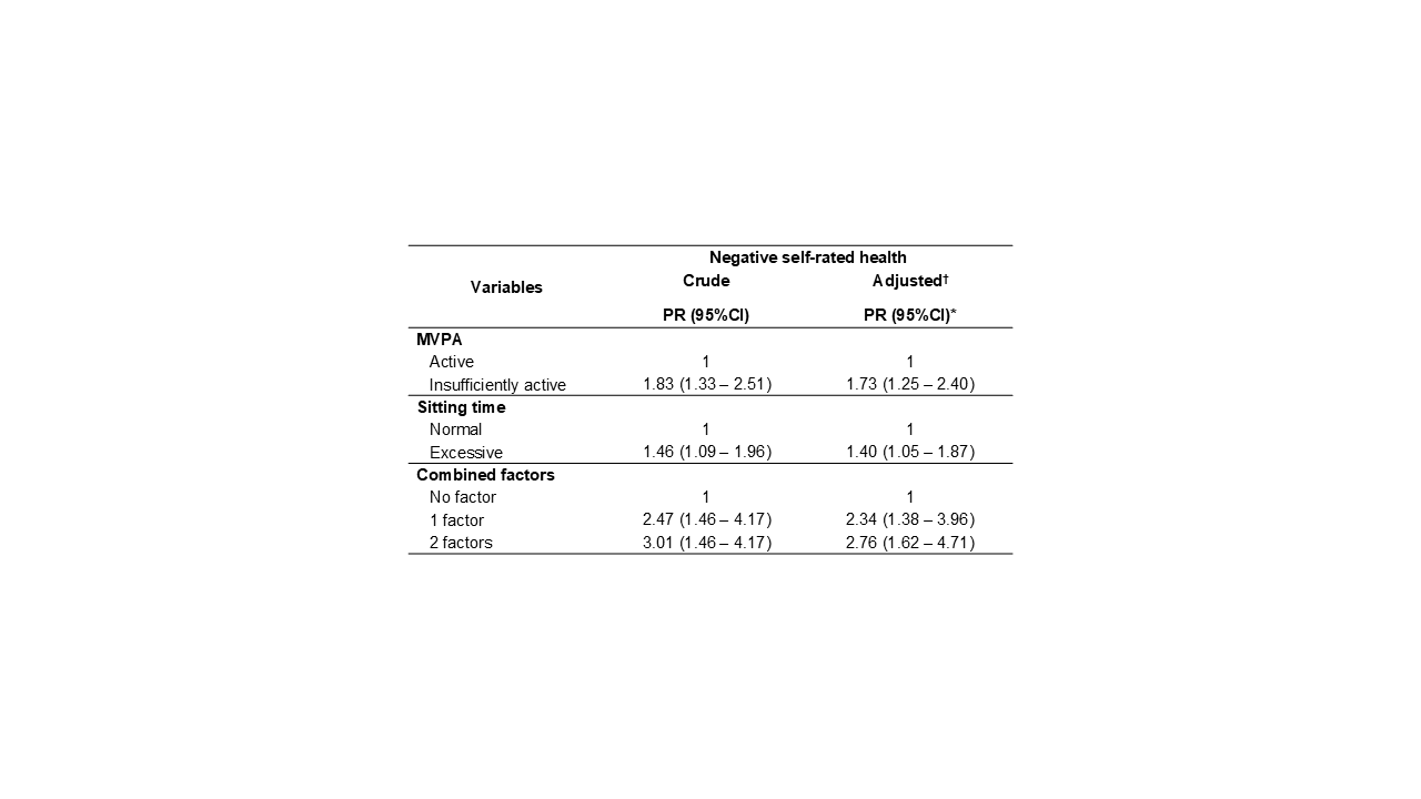 Abstract: The objective of this study was to analyze the isolated and combined linkage of insufficient physical activity and excessive sitting time on negatively self-rated health in university students. This is a cross-sectional study conducted with 418 students from a community university in western Santa Catarina, Brazil. Self-rated health was the dependent variable. Self-reported information on moderate to vigorous physical activity and sitting time was collected through a questionnaire. University students were classified as insufficiently active or with excessive sitting time if they did not meet the recommended guidelines. For the analysis, models were developed that considered physical activity and sitting time in isolation and in combination, using those who did meet the guidelines as a reference. The data was analyzed using Poisson regression, with adjustment for sociodemographic variables and characteristics related to the participants' degree. Results show that most of the participants were women (73.4%) and the average age was 22.9 years (SD = 5.3). Three out of every 10 university students had a negatively self-rated health. In addition, individually, insufficiently active university students and those with excessive sitting time were 1.73 (95% CI = 1.25-2.40) and 1.40 (95% CI = 1.05-1.87) times more likely to report a negatively self-rated health. In the combined analysis, when presenting both risk factors simultaneously, the probability of presenting negatively self-rated health was 2.76 (95% CI = 1.62 – 4.71). College students with insufficient physical activity and excessive sitting time are at a higher risk of negatively self-rated health, particularly when both behaviors are present simultaneously.