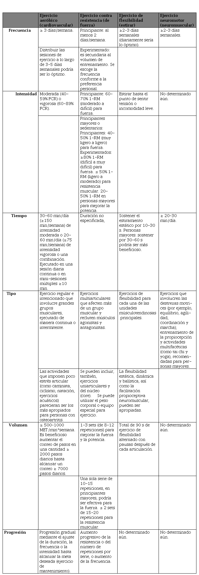 El ejercicio para la OA de cadera o rodilla debería conformarse a los principios de prescripción del ejercicio FITT-VP del Colegio Americano de Medicina Deportiva (American College of Sports Medicine [ACSM], 2021). En personas con OA de rodilla, las ganancias de fuerza son máximas cuando se prescribe el ejercicio de acuerdo con las recomendaciones del ACSM para el entrenamiento contra resistencia (Bartholdy et al., 2017). En aquellas personas con OA de cadera, el ejercicio solamente logra disminuir el dolor cuando la dosis cumple con las recomendaciones del ACSM para la aptitud cardiorrespiratoria, la fuerza muscular y la flexibilidad (Moseng et al., 2017). Los principios FITT-VP incorporan la frecuencia (qué tan seguido se debe uno ejercitar), la intensidad (qué tan fuerte debe ser el ejercicio), el tiempo (cuánto debe prolongarse el ejercicio), el tipo (la modalidad del ejercicio), el volumen (cantidad total de ejercicio) y la progresión (cómo debe avanzar el programa de ejercicio). La Tabla 2 resume estos principios para el ejercicio cardiovascular, contra resistencia, de flexibilidad y de neuromotricidad en adultos sanos. Estos principios, también, se aplican a todas las personas con OA de cadera o rodilla, sin importar la edad o la gravedad de la enfermedad.