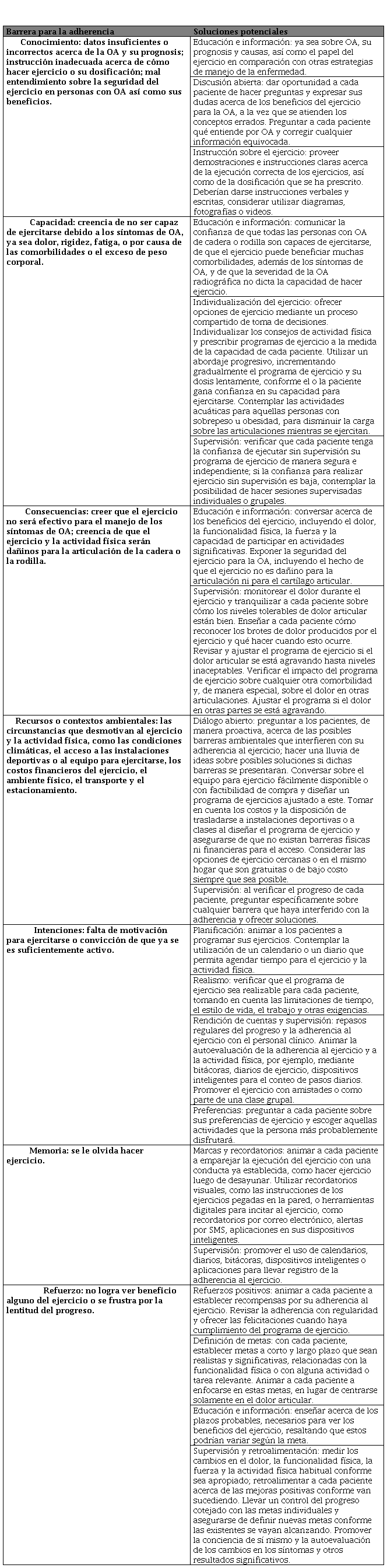 La Tabla 4 esboza una lista de verificación con los factores que cada profesional debería contemplar junto a cada paciente con OA de rodilla o cadera al prescribir su programa de ejercicio, con la cual puede ayudarse para identificar a aquellas personas con un riesgo aumentado de pobre adherencia al ejercicio. Es importante que los profesionales revisen la adherencia en cada cita, aunque no existe un método por excelencia para este monitoreo, pueden utilizar preguntas orales o pedirle a la persona que registre su participación o adherencia en calendarios, bitácoras, aplicaciones para dispositivos electrónicos, diarios o por medio de dispositivos portátiles, por ejemplo, conteo de los pasos diarios.