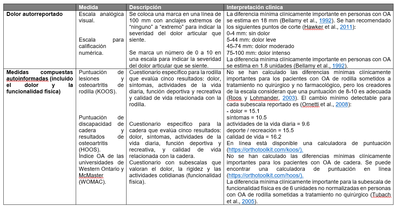 La Sociedad Internacional para la Investigación en Osteoartritis (Osteoarthritis Research Society International) recomienda que las intervenciones de ejercicio se supervisen utilizando resultados que evalúen los efectos del dolor, la funcionalidad física y la evaluación global del paciente. Los profesionales pueden elegir entre una variedad de resultados comunicados por los pacientes o medidas de rendimiento físico para elegir lo que se adapte al contexto de su práctica y sea factible de administrar, por ejemplo, tomando en cuenta el tiempo, espacio y recursos necesarios (Tabla 5). El dolor puede medirse fácilmente mediante autoinforme, utilizando medidas de resultados sencillas comunicadas por el paciente, como una escala de valoración numérica o una escala analógica visual. Aunque la funcionalidad física también puede medirse mediante autoinforme utilizando cuestionarios específicos de la enfermedad, la Sociedad Internacional para la Investigación en Osteoartritis ha recomendado un conjunto de pruebas para las personas con OA de cadera/rodilla basadas en el rendimiento, las cuales son adecuadas para fines clínicos (https://oarsi.org/research/physical-performance-measures); entre ellas, están la prueba de la silla de 30 segundos, la marcha rápida de 40 m, la prueba de subir escaleras, la prueba cronometrada de subir y bajar o la caminata de 6 minutos.