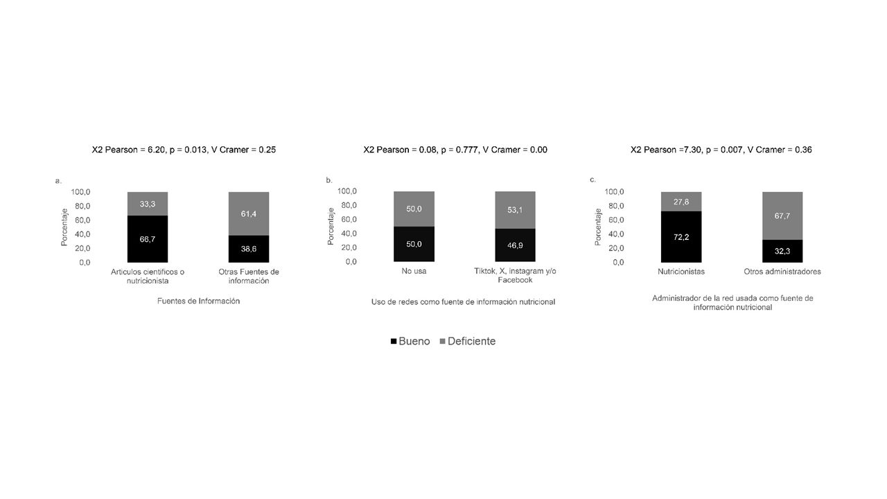 Se identificó una asociación significativa (p = .013) entre el nivel de conocimientos bueno en nutrición y el uso de fuentes de información nutricional basadas en artículos científicos o nutricionistas, con un tamaño del efecto moderado. El uso de redes sociales como fuente de información nutricional no mostró relación con el nivel de conocimiento en nutrición (p = .777). Sin embargo, se encontró una asociación entre el tipo de administrador de la red social usada y el nivel de conocimiento percibido (p = .007), también con un tamaño del efecto moderado. Los usuarios que siguen a nutricionistas en redes sociales tienden a reportar un mayor nivel de conocimiento nutricional.