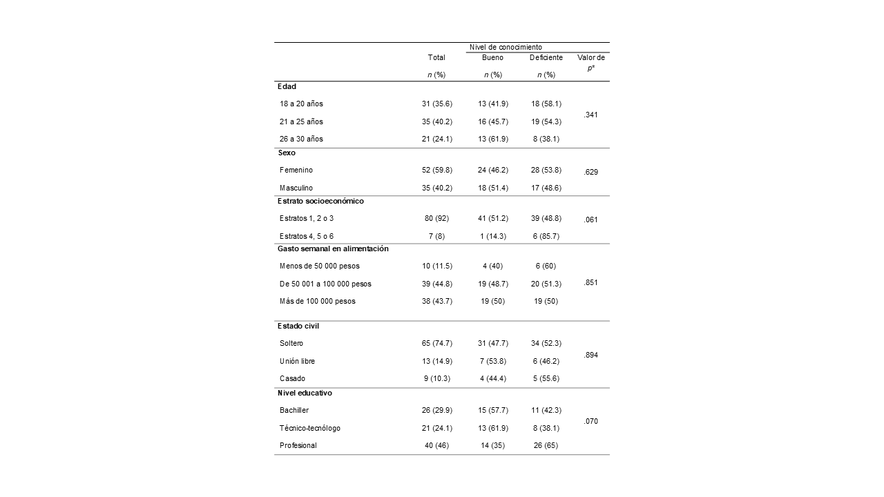 Un total de 122 participantes aceptaron participar en el estudio, de los cuales 35 fueron excluidos según los criterios establecidos. La muestra estuvo compuesta por un total de 87 participantes, con edades comprendidas entre los 18 y 30 años (con una mediana de edad de 22 años y un rango intercuartil de 20 a 25 años). Del total de los participantes, 52 (59.8%) eran mujeres. Además, 80 (92.2%) pertenecían a los estratos socioeconómicos 1, 2 o 3. Adicionalmente, 49 (56.3%) destinaban menos de 100 000 pesos en comida a la semana, 65 (74.7%) eran solteros, 40 (46%) culminaron una carrera profesional (Leal Lezcano et al., 2024).