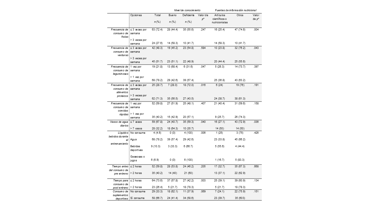La Tabla 2 muestra la asociación entre el nivel de conocimientos, prácticas alimentarias y fuentes de información nutricional. Se observó una asociación significativa entre el nivel de conocimientos bueno en nutrición y los siguientes hábitos alimentarios: menor consumo de leguminosas (X2 Pearson = 3.95, p = .047, V Cramer = 0.21), mayor frecuencia de consumo de alimentos proteicos (X2 Pearson = 5.78, p = .016, V Cramer = 0.25), mayor consumo de vasos de agua (X2 Pearson = 4.24, p = .040, V Cramer = 0.22), menor frecuencia de consumo de bebidas deportivas, gaseosas o jugos durante el entrenamiento (X2 Pearson = 12.4, p = .006, V Cramer = 0.37), y menor tiempo transcurrido después del entrenamiento para consumir alimentos (X2 Pearson = 8.82, p = .003, V Cramer = 0.31). Además, se encontró una asociación significativa entre el uso de fuentes de información de baja calidad y un menor consumo de frutas (X2 Pearson = 8.35, p = .004, V Cramer = 0.31), verduras (X2 Pearson = 4.09, p = .043, V Cramer = 0.21) y agua (X2 Pearson = 4.40, p = .036, V Cramer = 0.22). Todas las asociaciones presentaron un tamaño del efecto moderado.