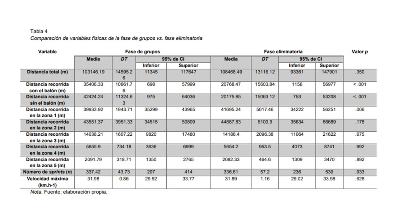 En este estudio, a pesar de que la distancia total recorrida no fue significativamente diferente, los equipos que empataron, los que no clasificaron a la fase eliminatoria y los que más avanzaron en el torneo cubrieron la mayor distancia en promedio. Los equipos que solo llegaron a la fase de grupos y los que más perdieron tuvieron una distancia total más significativa. Esta tendencia disminuyó a medida que avanzaba el torneo. Algunas de las comparaciones explicadas anteriormente presentaron diferencias estadísticas.