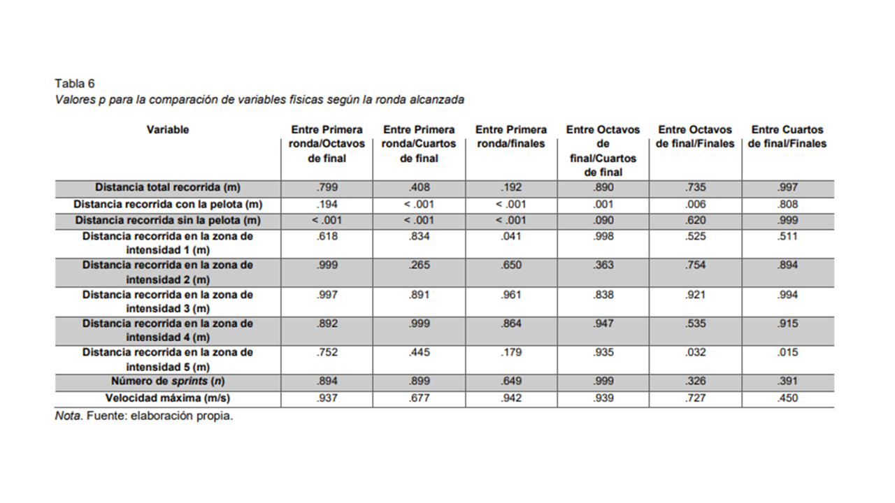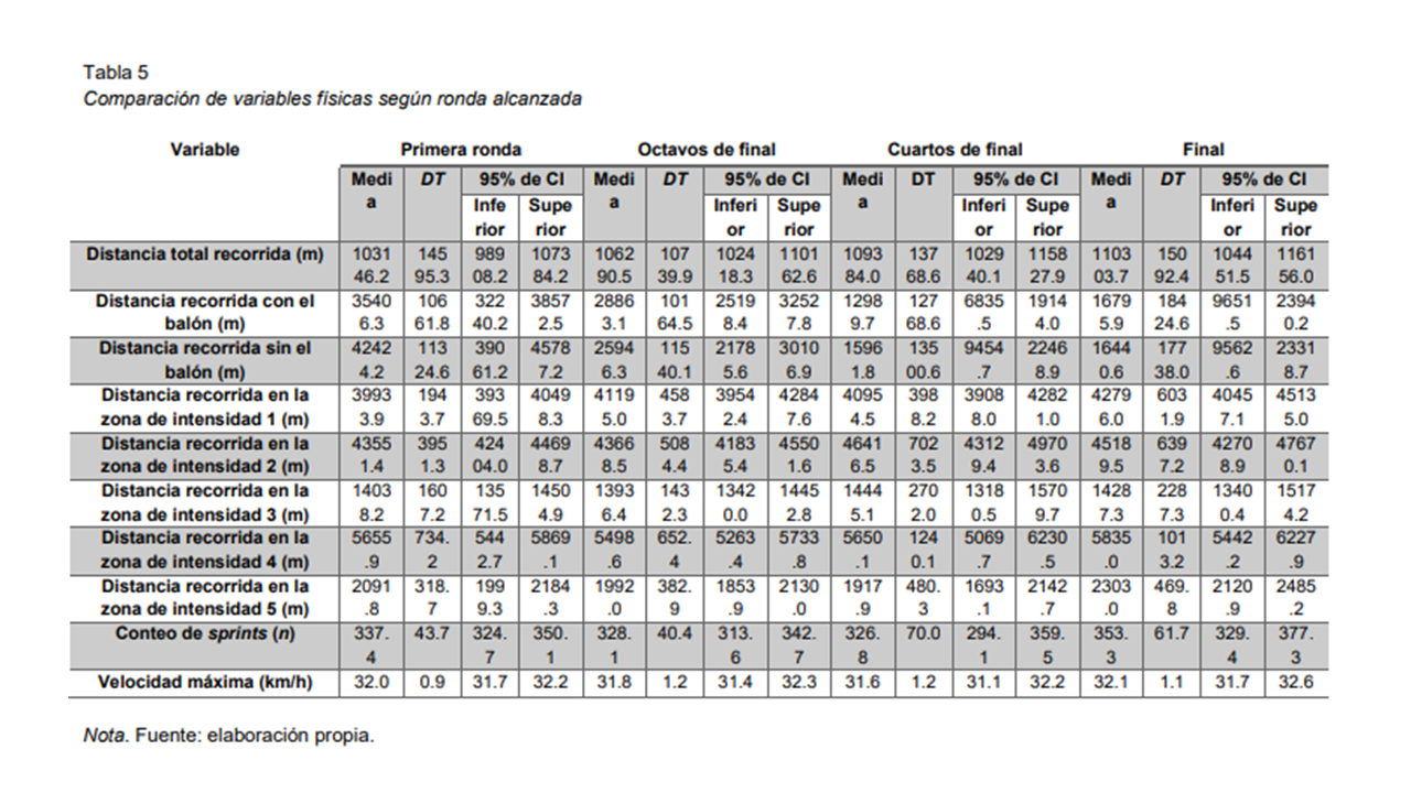 Se encontró la misma tendencia de las dos comparaciones anteriores según la fase alcanzada. Los equipos que avanzaron más lejos en el torneo recorrieron una distancia más corta, junto con una distancia más considerable en las zonas de intensidad 1 y 5 (con evidencia estadística; ver Tabla 5 y Tabla 6). La distancia total recorrida volvió a ser más significativa para los equipos que avanzaron más lejos en el torneo, pero sin diferencias estadísticas. No hubo tendencias en las demás variables.