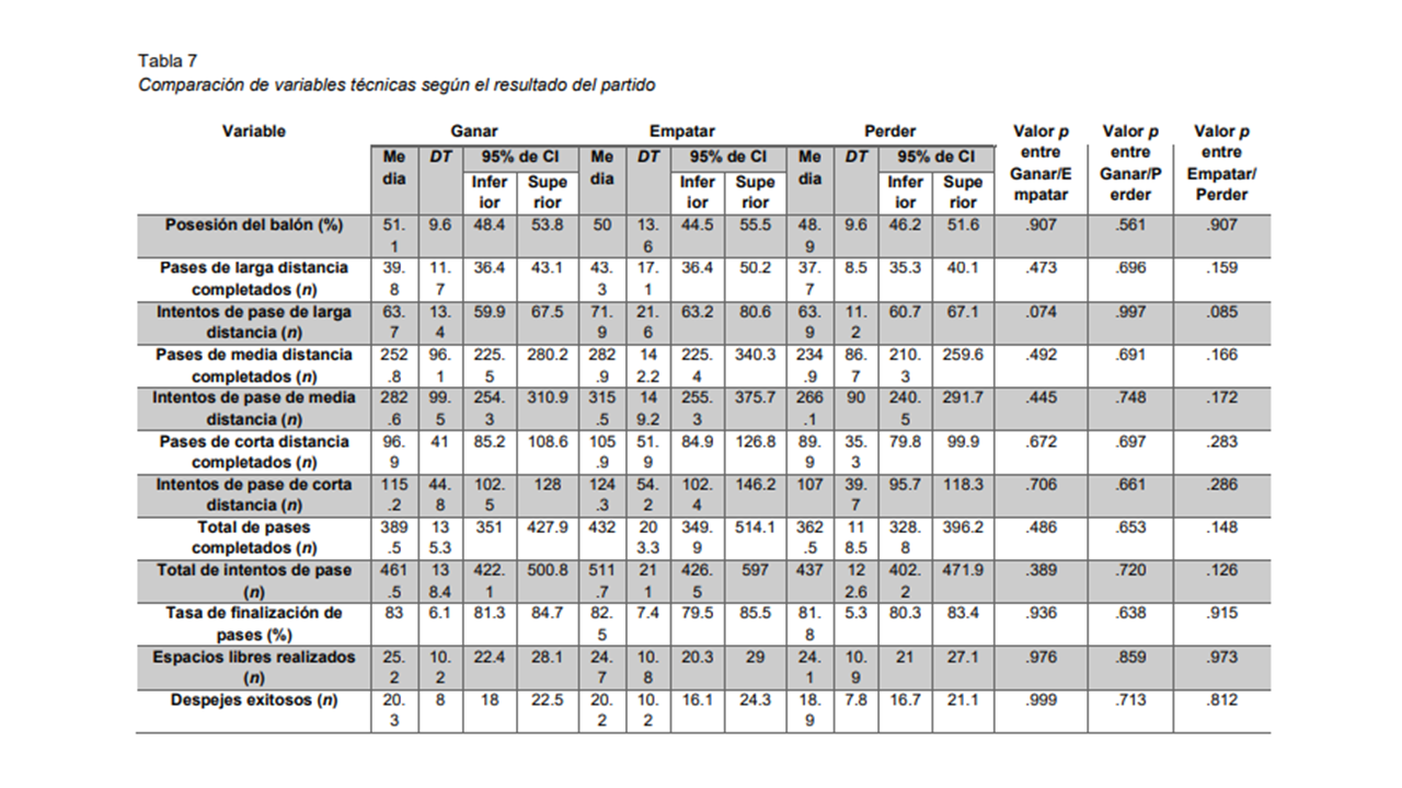 Ninguna de las variables técnicas mostró diferencias estadísticas entre los tres posibles resultados de los partidos. Sin embargo, se observó la misma tendencia: los partidos empatados mostraron números más significativos (sin significación estadística). Los datos se muestran en la Tabla 7.