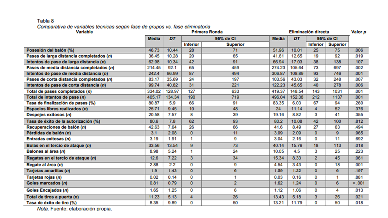 En la Tabla 8, la mayoría de las variables técnicas tendieron a ser significativamente más altas en los equipos que se clasificaron para la fase eliminatoria.