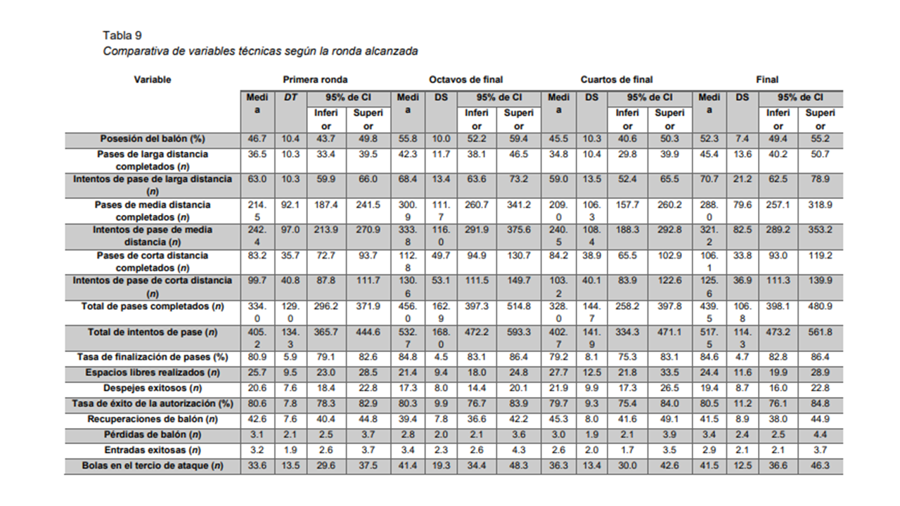 Los equipos que se clasificaron para la fase eliminatoria mostraron un rendimiento significativamente mejor en algunas variables técnicas. Estos resultados pueden considerarse indicadores de rendimiento, ya que se ha observado la evolución de algunas de estas variables a lo largo del tiempo (Barnes et al., 2014; Wallace et al., 2014), y su análisis ha permitido diferenciar los equipos exitosos de los no exitosos (Castellano et al., 2012). Por ejemplo, en este estudio, la tasa de éxito en los pases fue superior al 80% y los jugadores de la Premier League registraron una efectividad superior al 70% (Barnes et al., 2014). Esta diferencia podría esperarse, ya que los mejores jugadores de cada país van a la Copa del Mundo.