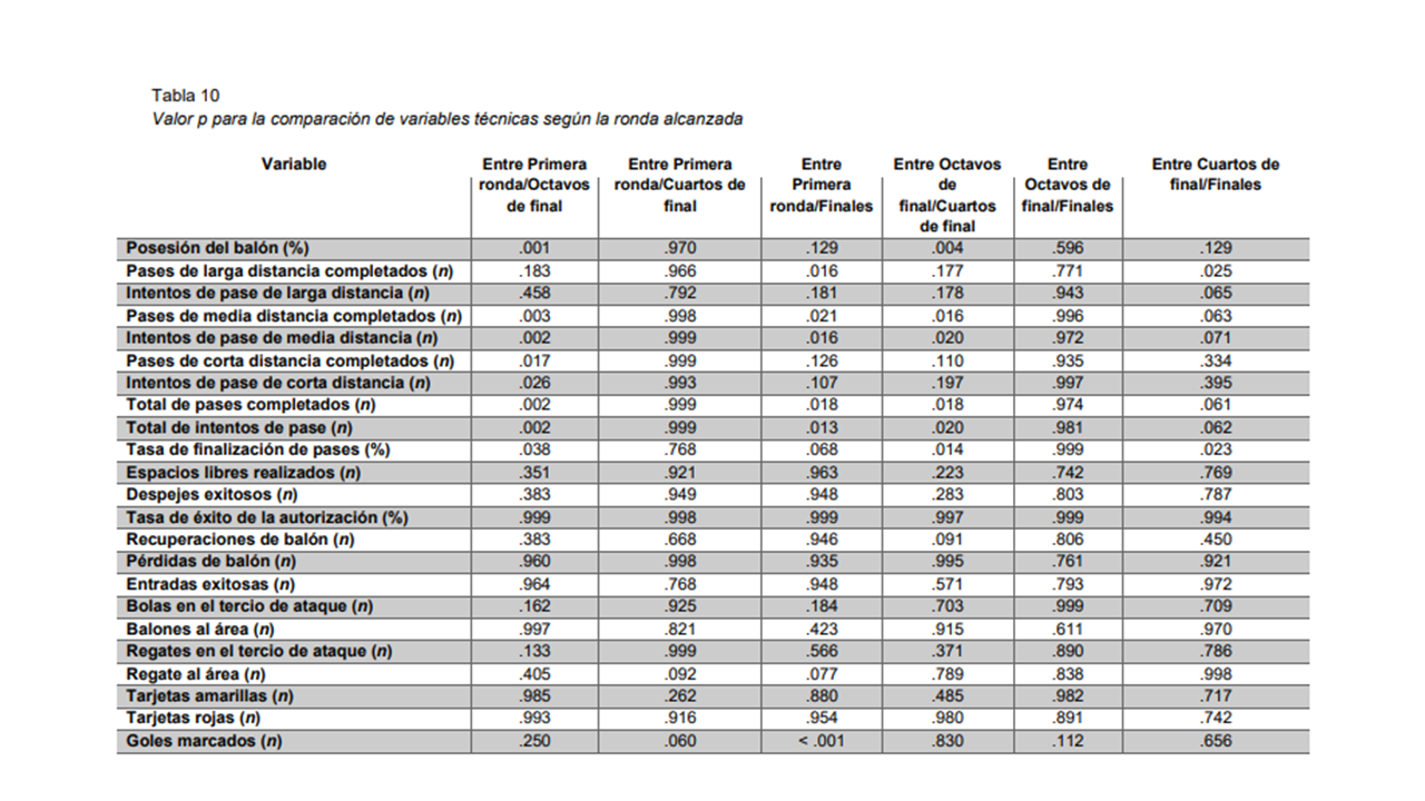 Se encontró una tendencia extraña: los equipos en octavos de final y en la final realizaron más acciones de juego en la mayoría de las variables, algunas con y otras sin diferencias estadística (Tabla 9 y 10).