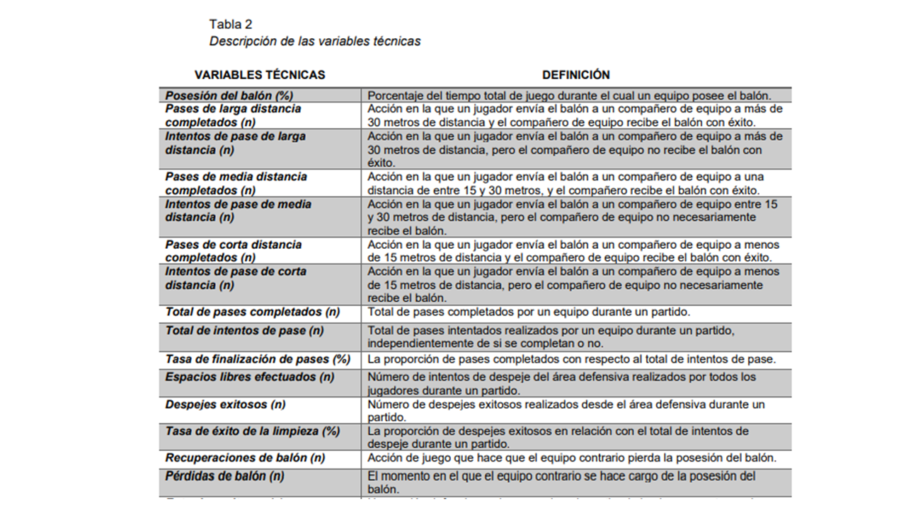 Hay menos información sobre las variables técnicas del juego; sin embargo, estas muestran una asociación entre el número de pases, el porcentaje de acierto en los pases superiores al 70%, el número de entradas realizadas, la cantidad de recuperaciones de balón y los tiros a puerta realizados por un equipo con el hecho de ganar un partido (Barnes et al., 2014; Bradley et al., 2013; Russell et al., 2013; Yi et al., 2018). Por eso, el análisis de estos aspectos es plausible, ya que podrían ofrecer información sobre cómo algunas de esas variables pueden llegar a ser críticas en el resultado del juego.