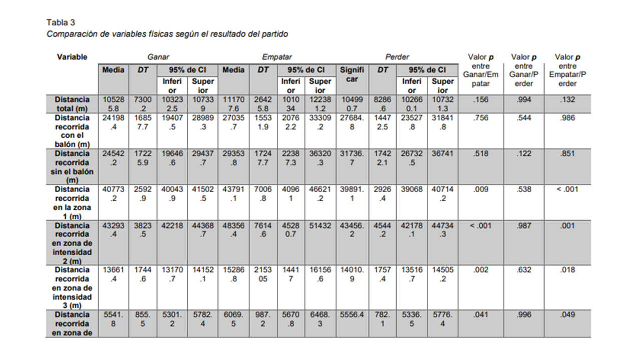 Uno de los aspectos más estudiados dentro de las variables físicas es la distancia total recorrida en un partido. Sin embargo, su asociación con el rendimiento en el fútbol no es clara (Balyan et al., 2007; Dufour et al., 2017). En la Premier League, la evolución de la distancia recorrida desde la temporada 2006-2007 hasta la temporada 2012-2013 solo mostró un incremento del 2%, siendo diferente a otras variables físicas, como la distancia recorrida al correr, que mostró un incremento del 35% en este mismo periodo (Barnes et al., 2014). En este estudio, no se observaron diferencias en la distancia total recorrida por los equipos en ninguno de los análisis realizados. Estos resultados están en línea con los reportados en los Mundiales de 2010 y 2014, cuando la distancia total recorrida no permitió calificar el desempeño y el éxito de los equipos participantes (Clemente et al., 2013; Dufour et al., 2017). Incluso algunos estudios de la Serie A del fútbol italiano y de la Premier League inglesa han sugerido que los equipos menos exitosos tienen más distancia total recorrida (Di Salvo et al., 2009; Rampinini et al., 2009).