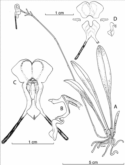 Plant caespitose, epiphytic, medium in size 6-13 cm tall. Roots slender, flexuous, 1 mm in diameter. Ramicauls abbreviated, terete, erect, slender, 10-40 mm long, enclosed by two or three tubular sheaths. Leaf erect, coriaceous, minutely verrucose, long petiolate, 5-9 cm long including the petiole; the blade 3-5 × 0.8-1.2 mm, narrowly obovate; the apex subacute, mucronate; the base narrowed into a slender, conduplicate petiole 2.0-4.5 cm long. Inflorescence congested, successively few-flowered (three to five flowers) raceme; peduncle 20 cm long, slender, glabrous, erect to suberect, with a few widely spaced, thin, translucent bracts, floral bracts tubular, imbricating, 8-9 mm long; pedicel 10-13 mm long; ovary smooth, sparsely pocked, 4-5 mm long. Flowers resupinate, with a detectable cinnamon and clove fragrance. Sepals translucent white; the dorsal sepal depressed obovate, bilobed, 3-veined, 5 × 10 mm expanded, spotted with purple subulated short hairs and more densely covered throughout the veins, gradually increasing in density towards the apex and the tail, connate to the lateral sepals for 3 mm to form a gaping cup; the apex acutely reflexed, obtuse, minutely apiculate, abruptly contracted into a conduplicate tail 3 mm long that does not reach the ovary; the lateral sepals oblong, oblique, glabrous, 3-veined, 6-7 × 4 mm, connate 5 mm to form an acute mentum below the columnfoot; the apices oblique, acute, contracted into slender, brownish-purple tails, thickened along the middle, 11 mm long. Petals translucent yellow, the color intensity gradually increasing towards the apex, with a redpurple, translucent midvein, ovate-lanceolate, glabrous, 5 × 2 mm narrowed to the slightly dilated, rounded, sub falcate apex; the lower margin with a subacute angle near the middle; the upper margin obtusely angled near the middle. Lip white, suffused with dispersed purple dots, sensitive and actively motile; the blade widely obtrullate, 5 × 4 mm; the broadly thickened callus with a shortly elevated keel running longitudinally towards the base; the apex minutely pubescent, acute, with a sulcus running 2 mm from the apex to the center of the blade; the base deflexed and hinged to the free apex of the column-foot by a strap-like claw. Column white, stout, semiterete, 3.5 mm long, with two tooth-like processes near the stigma; the column-foot slender, curved, 4 mm long. Pollinia 2, droplet shaped, each with a glandular caudicle. Fruits and seeds not seen.