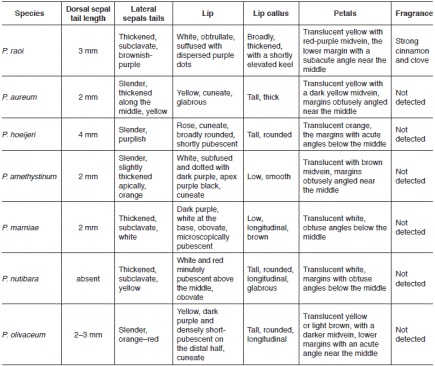 Porroglossumraoi is considered as a different species by a unique combinations of features, being the strong cinnamon and clove smell the most notorious characteristic. The most similar and, probably, most closely related species is P. aureum which was discovered not too far from where P. raoi grows; it also shares similar features with P. marniae (Fig. 3). Nonetheless, the white flowers with a short channeled tail of the dorsal sepal, the brownishpurple, thickened along the middle tails of the lateral sepals, the lower margin of the petals with a subacute angle near the middle and the detectable cinnamon and clove fragrance immediately separate it from similar species (Table 1; sources Luer 1980, 1987, 1988, 1989, 1991, 1994, 1995, 1998, 2006, Merino, Doucette & Pupulin 2010, Kolanowska & Szlachetko 2013).